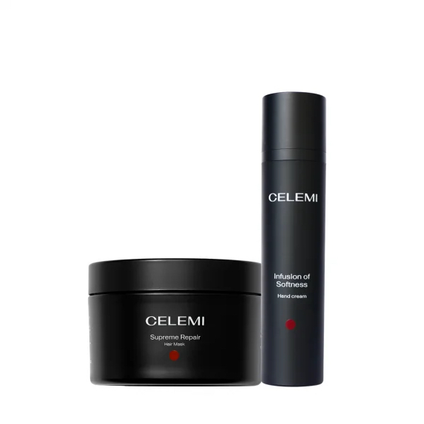 CELEMI plaukų kaukės Supreme Repair ir rankų kremo Infusion Of Softness rinkinys skirtas visapusiškam plaukų atstatymui bei intensiviam rankų maitinimui.