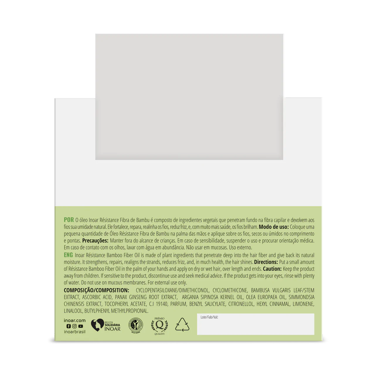 INOAR Resistance Fibra de Bambu Oil stiprinantis ir blizgesio suteikiantis aliejus plaukams. Aliejuje esantys natūralūs ingredientai giliai skverbiasi į plauko sluoksnius bei juos drėkina. Stiprina plauko saitus, mažina pūtimąsį, suteikia sveikų plaukų blizgesį.