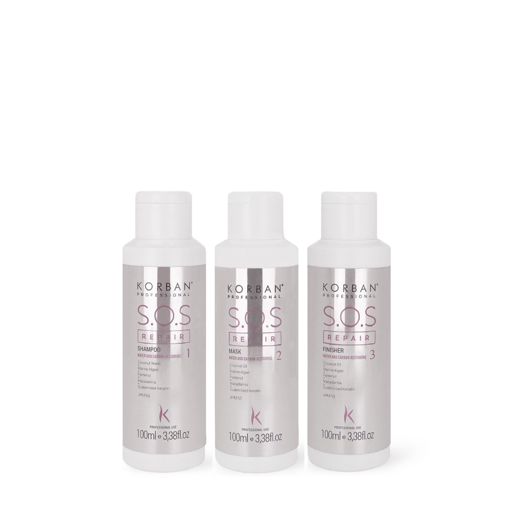 KORBAN SOS Repair rinkinys: šampūnas, kaukė, serumas 3 x 100 ml / 2 x 500 ml, 250 ml skirtas giliam plaukų atstatymui molekuliniu lygiu. KORBAN SOS Repair – profesionalių produktų kompleksas, praturtintas hidrolizuotu keratinu, leidžia atkurti pažeistas plaukų vietas, aminorūgščių mišinys sukuria apsauginį mikrotinklelį plauko viduje, o vynuogių ekstraktas tonizuoja pažeistus plaukus, giliai prisotindamas juos vitaminais ir mikroelementais, sugrąžindamas prarastą elastingumą. Sušvelnina cheminių procedūrų poveikį ir apsaugo plaukus nuo žalingo terminio poveikio.