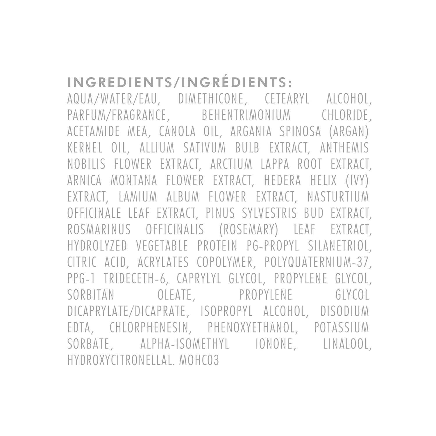 Sudėtis: Water, Dimethicone, Cetearyl Alcohol,Fragrance, Behentrimonium Chloride,Acetamide MEA, Canola oil, Argania Spinosa Kernel oil (Argan Oil), Hydrolyzed Vegetable Protein PG-Propyl Silanetriol, Butylene Glycol,Chondrus Crispus (Carageenan) Extract,Ascophyllum Nodosum Extract, Palmaria Palmata Extract, Laminaria Saccharina Extract, Undaria Pinnatifida Extract,Phenoxyethanol, Isopropyl Alcohol, Caprylyl Glycol, Citric Acid, Chlorphenesin,Butylphenyl Methylpropional, Hydroxyisohexl 3-Cyclohexene Carboxaldehyde, Linalool,Alpha-Isomethyl Ionone.