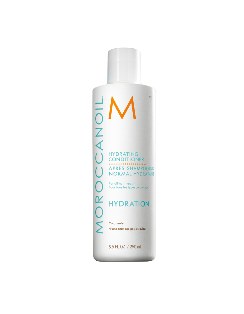 MOROCCANOIL drėkinantis kondicionierius Hydrating Conditioner 250ml – skirtas sausų ir pažeistų plaukų priežiūrai. Šis MOROCCANOIL drėkinantis kondicionierius yra praturtintas argano aliejumi, kuris pasižymi intensyviai drėkinančiomis ir maitinamosiomis savybėmis, pagalba išsausėjusiems plaukams. MOROCCANOIL drėkinantis kondicionierius padeda atstatyti plaukų struktūrą, suteikia jiems švelnumo, glotnumo, paklusnumo, elastingumo ir spindesio. Plaukai tikrai bus žvilgantys, minkšti bei lengviau formuojami. Produktas puikiai tinka kasdienei priežiūrai ir yra švelnus, todėl tinkamas visiems plaukų tipams, ypač sausiems, dažytiems plaukams.  Naudojant reguliariai, plaukai tampa lengviau valdomi, mažėja jų lūžinėjimas ir sausumas. Praturtintas maistinėmis medžiagomis. Be sulfatų,  parabenų, fosfatų ir druskų.