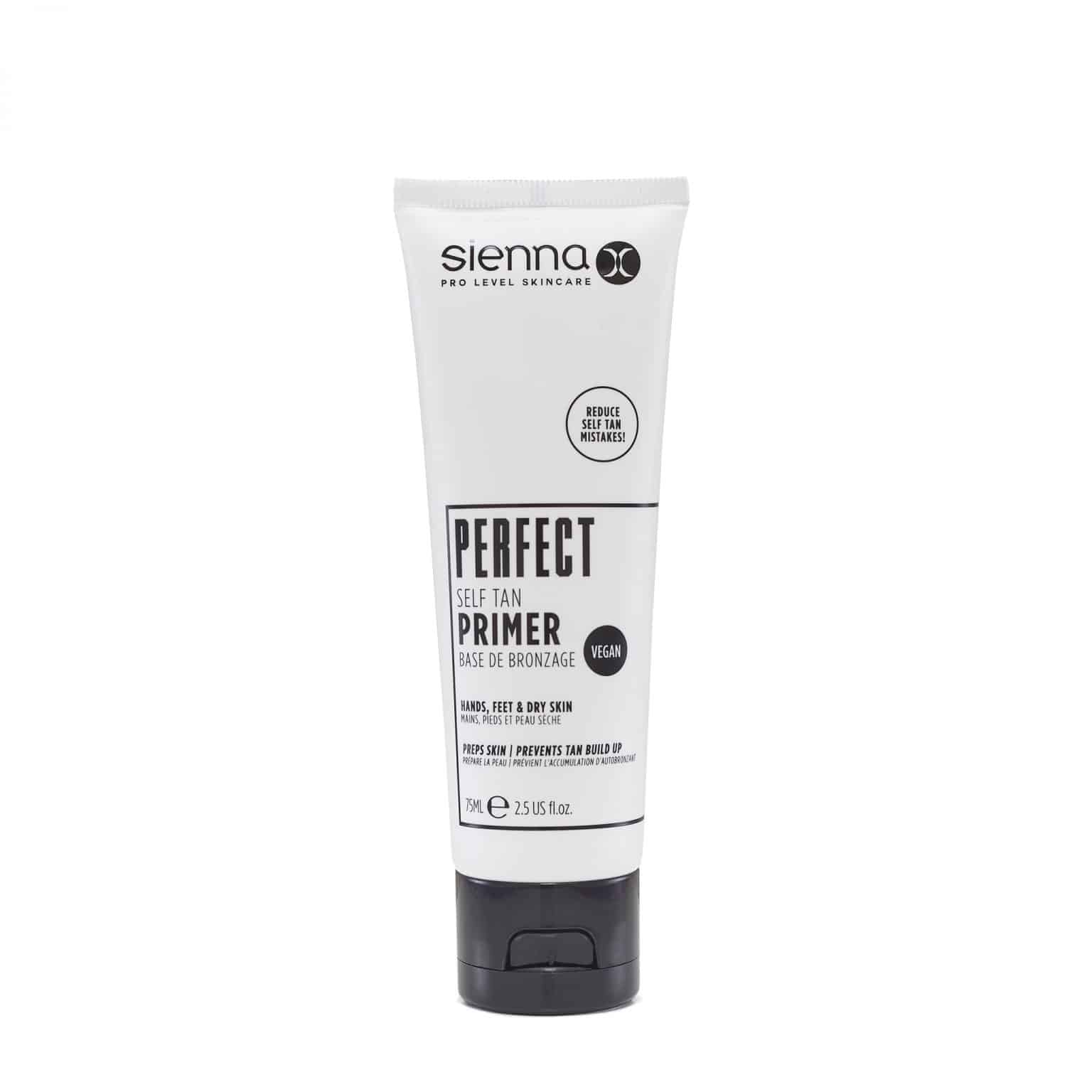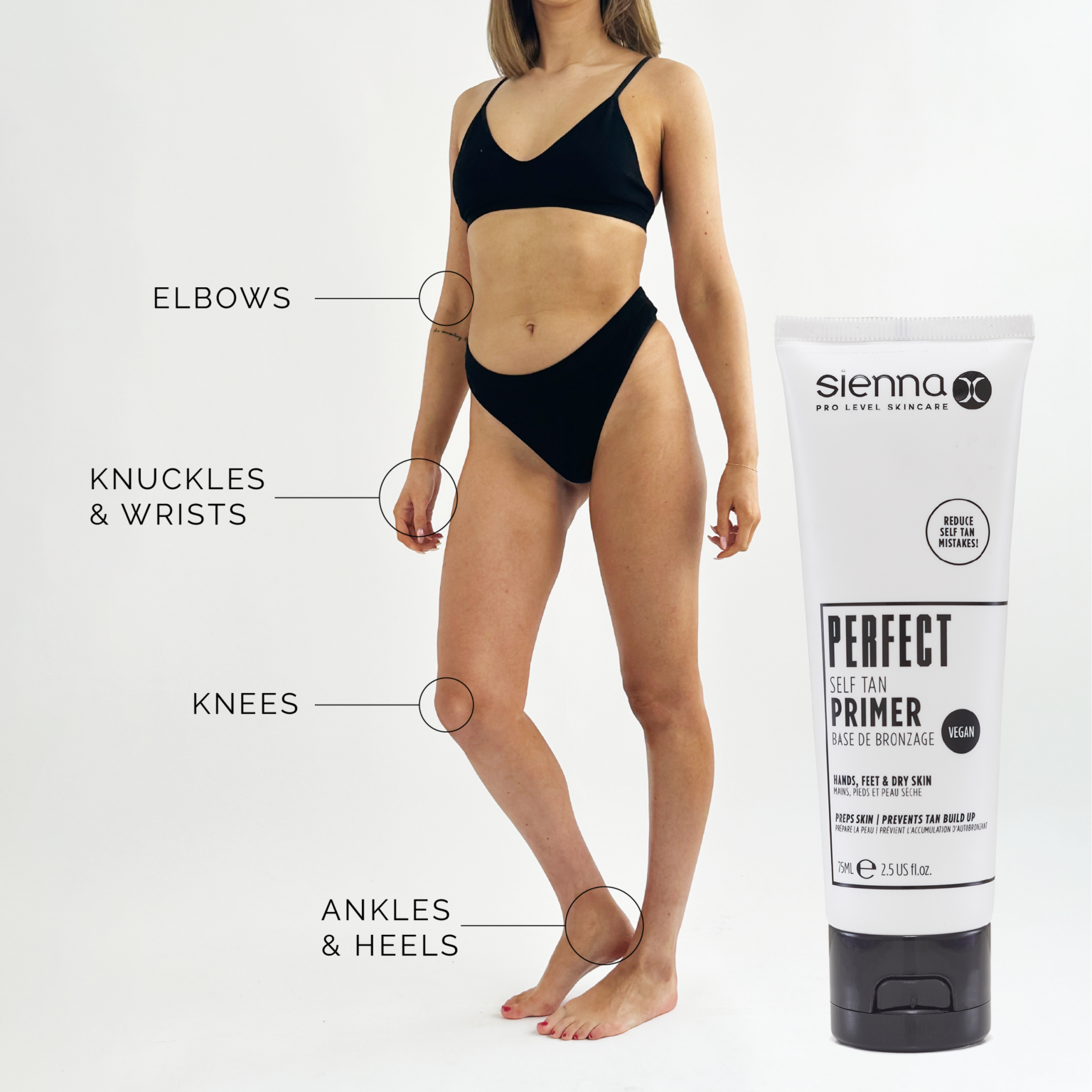 Sienna X Perfect Self Tan Primer savaiminio įdegio paruošimo priemonė – losjonas skirtas sausoms kūno vietoms: keliams, plaštakoms, pėdoms, alkūnėms.